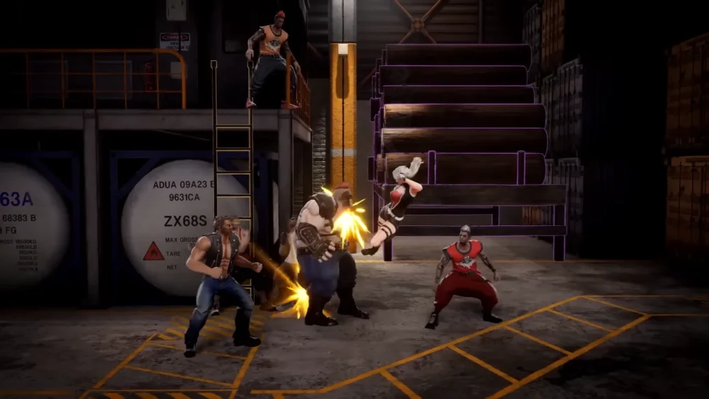 - ステージ各所には、敵をぶつけると発動するギミックがあり、体力の多い敵でも一瞬で倒すことができる。冷蔵庫に蹴り入れて攻撃したり、バイクをパルクールで乗り越えたりできる。壁際での掴み技は、敵に大ダメージを与えるか、ギミックや敵集団に投げ飛ばすかといった戦略が問われる。