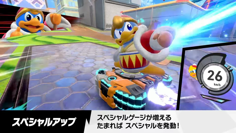- カービィやデデデ大王など歴代キャラが参戦。ライダー固有の「スペシャル技」が搭載され、逆転も狙えます。