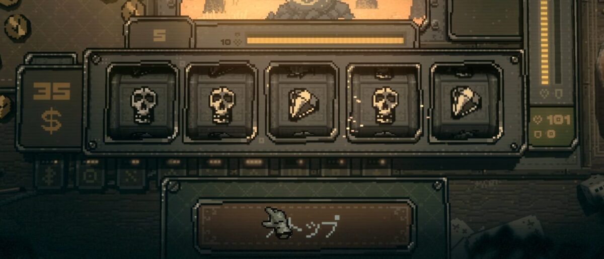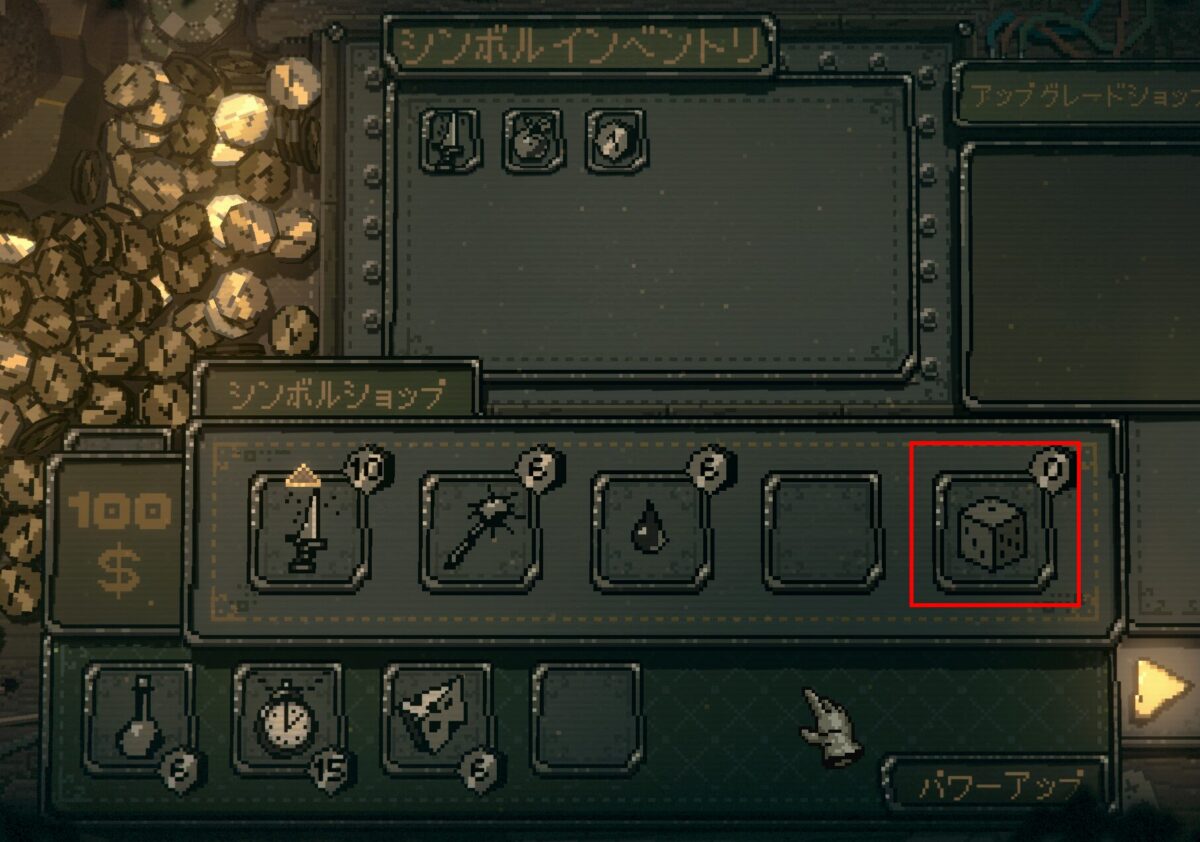 ちなみに、リールに出現しない、ターン終了後に表示されるシンボルの名称はなんなんでしょうね?パッシブシンボルとアイテムシンボル?とりあえずパッシブシンボルとアイテムシンボルということにして紹介します。これらもステージ開始時にリロールすることで初手から揃えられます。あとはステージ進みながら強化するなり無視するなりしましょう。
