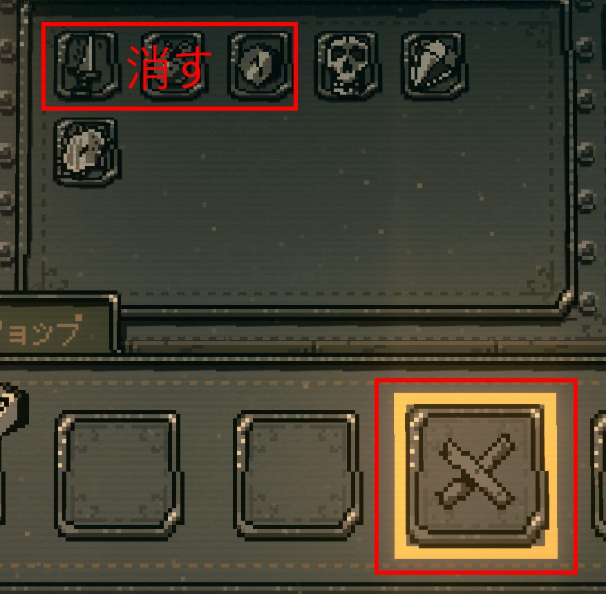 4つ以上のリール用のシンボルを持っていると×ボタンが出現します。これを利用すると要らないシンボルを削除可能です。”スピンブレード” ”ダイヤモンド” ”死の呪い”以外のリール用シンボルを消しましょう。