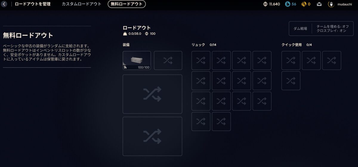 出撃時に無料ロードアウトを選択できるのをご存知?出撃ステージを決めたら装備選択画面でRBボタン等でタブを切り替えると無料ロードアウトを利用できます。これは基本的な装備をセットした状態で出撃できます。何を持っているかはランダムです。無料です。