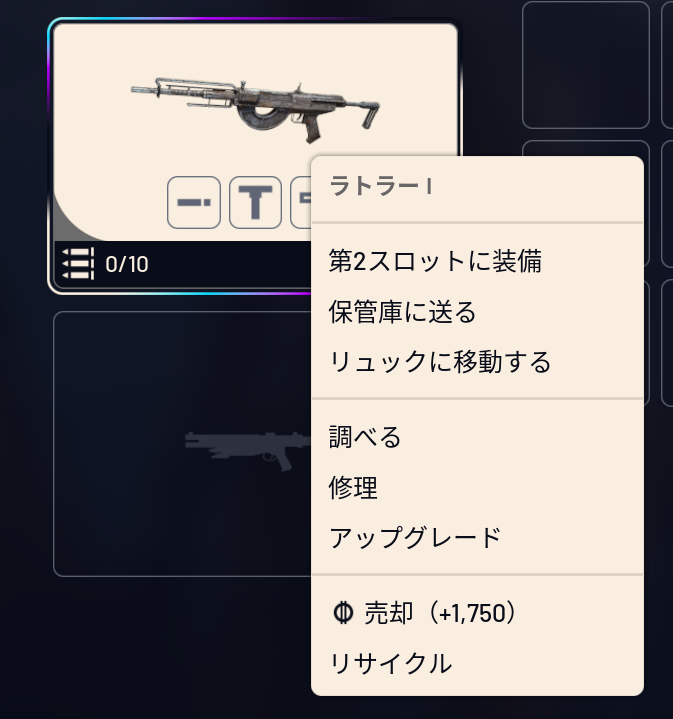 無料ロードアウトでもらった装備はそのまま持って帰ります。グレなども貰えるので使っていなければ売るか分解しましょう。武器は単価が高いのでコツコツ売ればそれなりのお金になります。持ち帰る武器によって売値はまちまちなので稼ぎ量は結構上下すると思います。