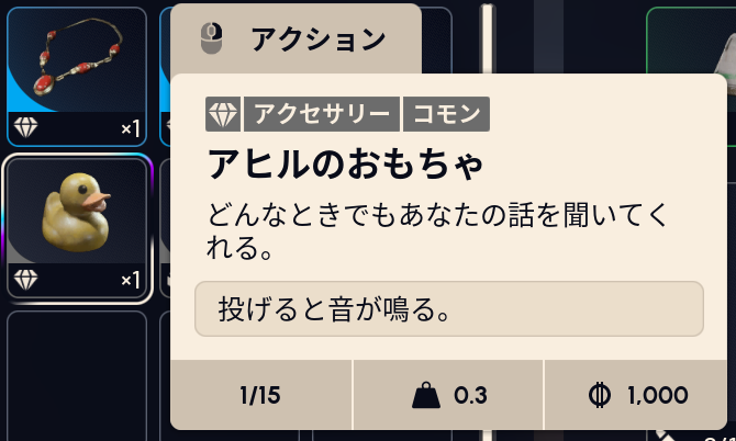 中にはアヒルちゃんのようにクイックアイテムに使える物もあります。