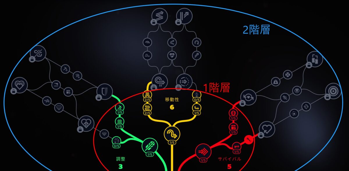 スキルツリーは3系統に別れ、それぞれ2階層に別れています。それぞれ全く異なる分類かと思いきや、結構ごちゃまぜです。