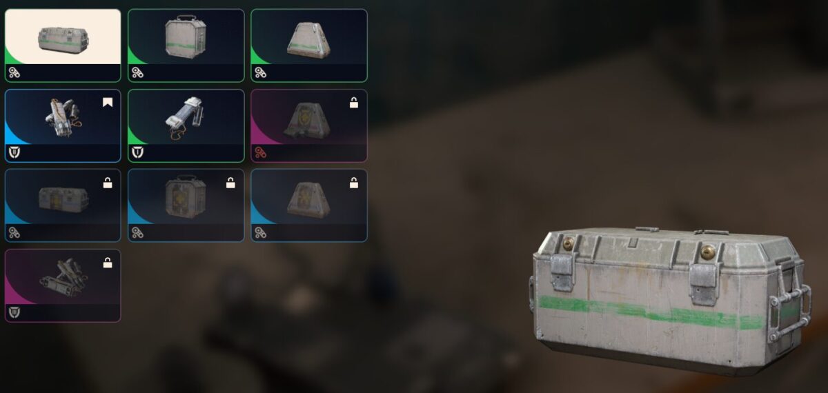 インベントリスロット数、安全ポケット数、最大所持重量、シールド互換性が異なる。2以降はスキル付き。