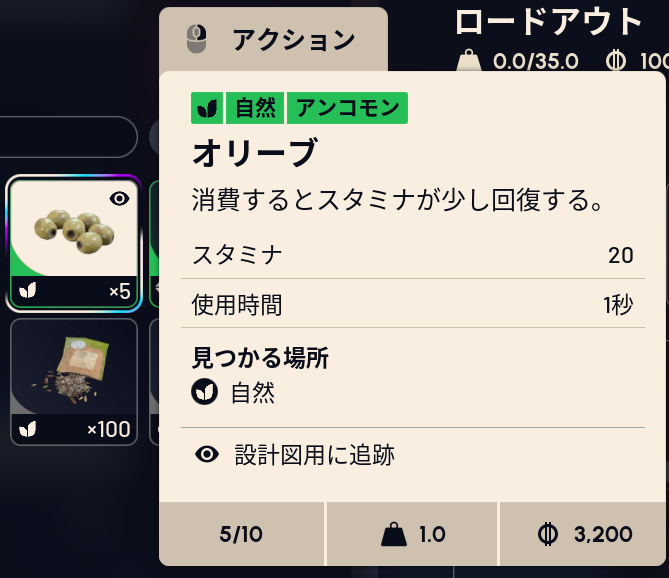 オリーブは他の果実と同様に木をインタラクトすると落とします。インタラクトできなくても周囲に落ちていることがあるので探してみてください。