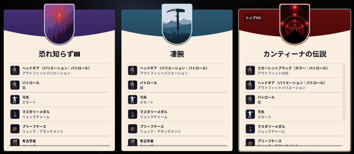 この記事を書いているシーズンでは、最も報酬の多い”カンティーナの伝説”で下記をもらえます。下から順に追加されていきます。