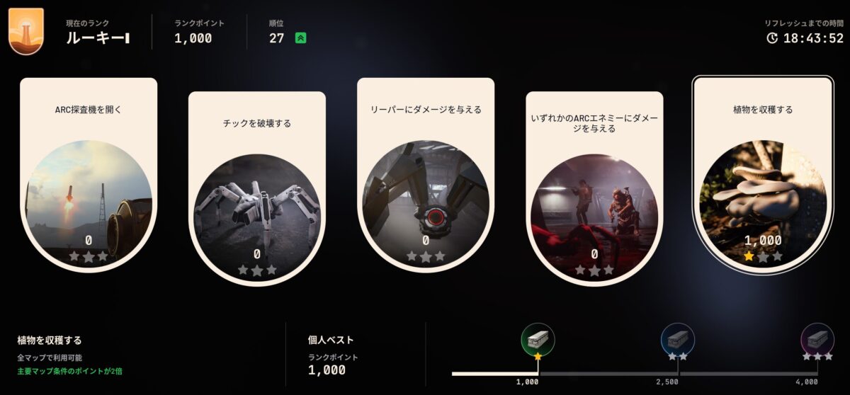 5つの課題があり、それぞれ達成することでそれぞれにポイントが溜まります。そしてそれぞれに1,000、2,500、4,000の累計ポイントに達するタイミングで対応したレアリティのクレートを貰い自動的に開かれます。中身はランダムアイテムです。