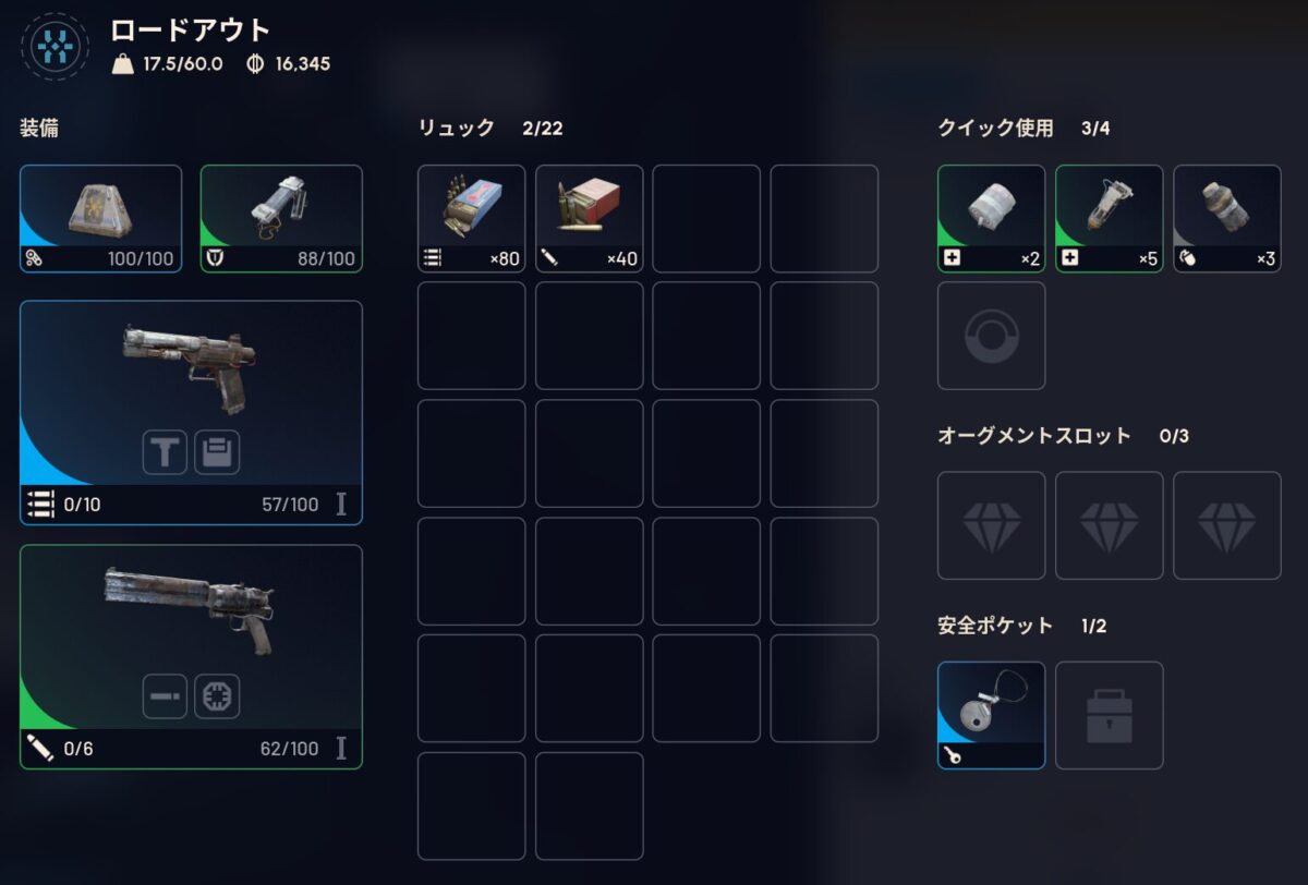 これにバリケードだったり、扉ロックやブレイズなど探索目的に沿ったクイックアイテムを持ち込む。