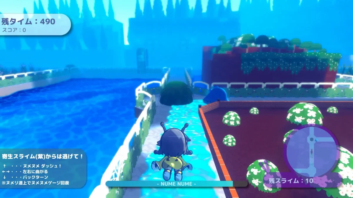 本作のユニークポイントは「ヌメヌメ」を活かしたシステムです。メイナは「ヌメヌメダッシュ」で素早く移動できる一方、水分を消費するため、むやみに使い続けることはできません。