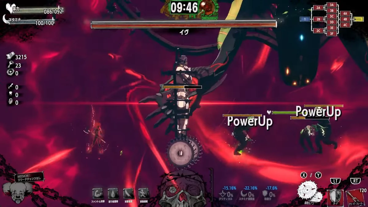 - 敵を倒して血を集めると「スプラッターメーター」が溜まります。メーターが溜まるとキャラクターが強くなっていき、最大まで溜めると「カーニバル覚醒」という強力な必殺技が使えます。メーターは攻撃をやめたりダメージを受けたりすると減ってしまうため、自然と攻撃的なプレイスタイルになります。