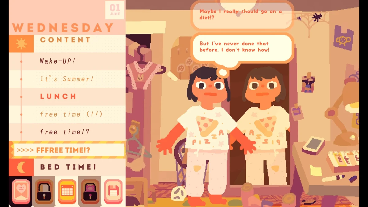- 不健康なダイエットがゲームプレイの中心ですが、物語では摂食障害そのものの原因や結果について深く掘り下げられていません。「主人公がある日突然、食べることをやめた」と語られるだけで、その過程が描かれないため、体験の目的が曖昧なまま終わります。