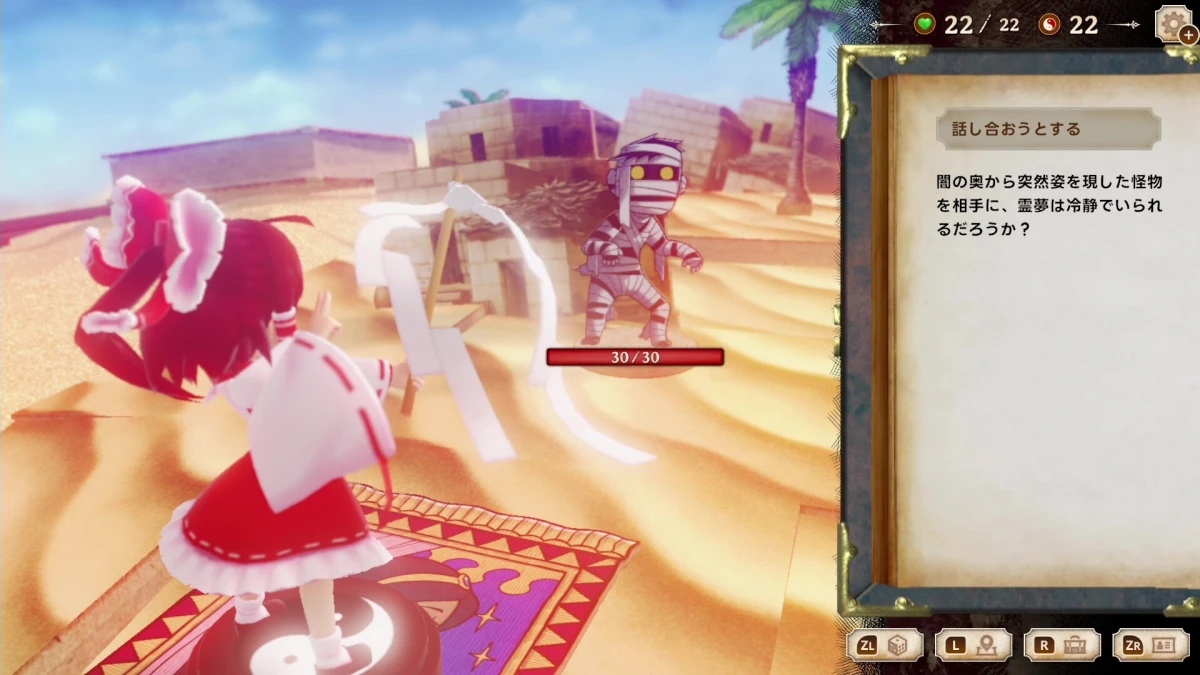 - 霊夢が小さな駒としてジオラマのような背景を移動する、本の中を冒険しているかのような見た目が特徴です。行動や状況がすべてナレーションされるため、ゲームへの没入感が高まります。